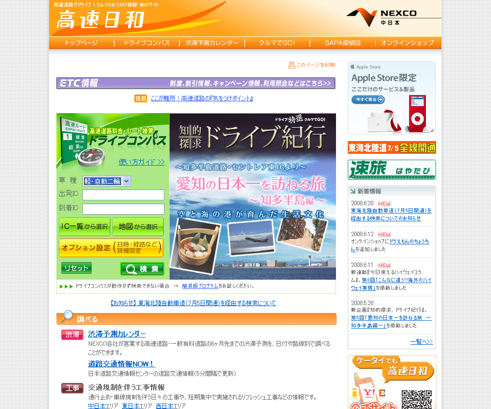 中日本NEXCOのサイト、高速日和、